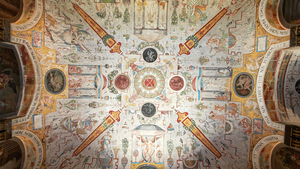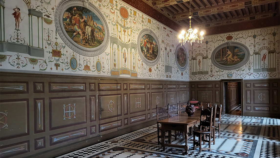 Classé Monument Historique, ce fleuron de la Renaissance abrite un décor rarissime et foisonnant, attribué aux plus grands maîtres Italiens, Flamands et Bourguignons des XVIe et XVIIe siècles. L’ensemble témoigne de la passion extrême que porte son commanditaire pour l’art antique et l’art italien.