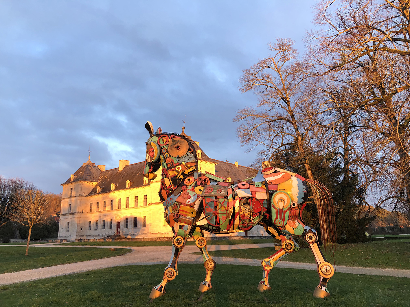 L’oeuvre monumentale vous accueille côté jardins. Cheval majestueux, symphonie de couleurs, façonnée d’une multitude de pièces métalliques et d’outils agricoles – Le corps animalier ici l’expression quasi d’un pur classicisme, réalisé entièrement en matériaux recyclés ; roues dentées, bielles, râteaux, bêches, fourches, roues, plaques tout azimut juxtaposés et interprétant la beauté animale, sa force, grâce et puissance. L’anatomie, muscles et courbes harmonieuses, laissant à l’oubli la mécanique et la machine. Une légèreté et délicatesse extrême, évoquant étonnamment et pertinemment le rhinocéros de Dürer.